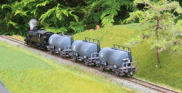 Damplokomotivet litra Q har ingen besværg med de tre toakslede tankvogne. Stille og rolig bevæger…