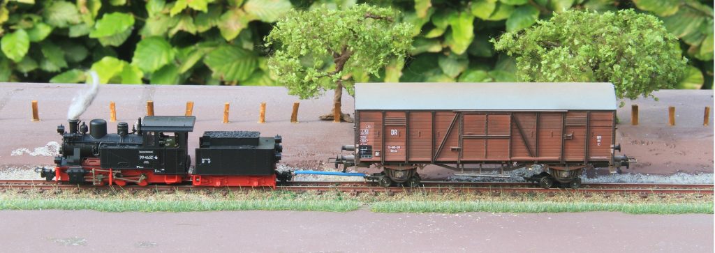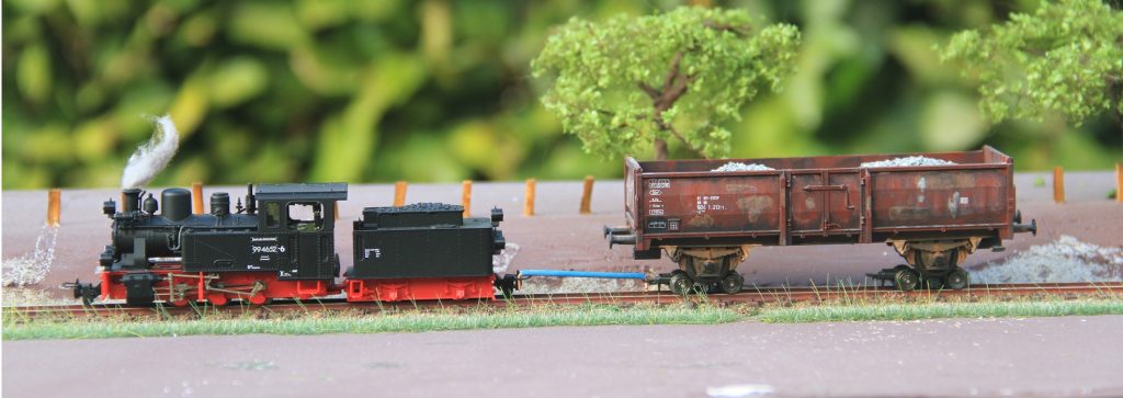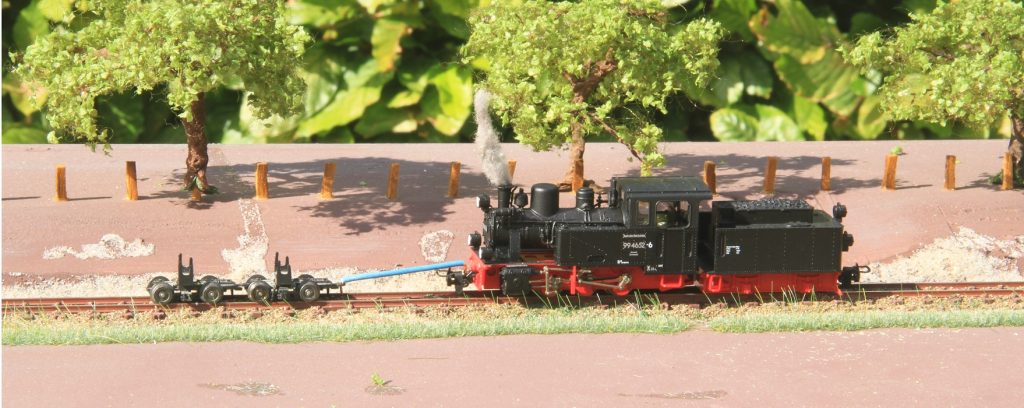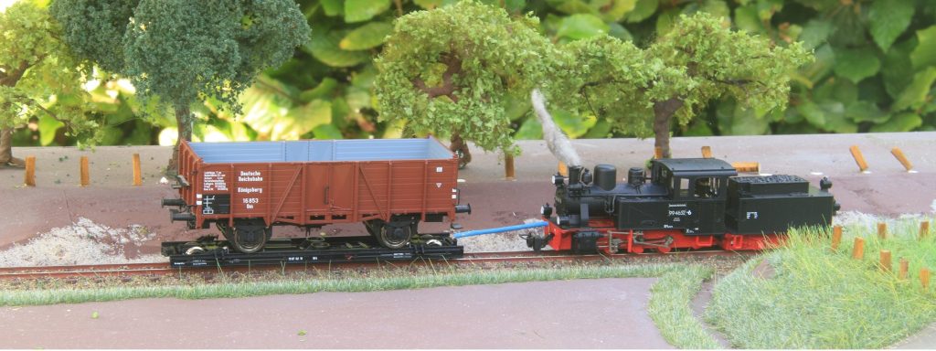 På et færdigbygget modul, hvor landskabet er under behandling, slæber det lille damplokomotiv af sted med en rullevogn fra Roco, hvorpå en Om vogn af type Königsberg fra Brawa bliver transporteret. Trækstangen imellem lokomotivet og rullevognen, er en hjemmelavet kobberledning, som er tilpasset formålet. Denne hjemmelavet koblingsstang er isoleret for at undgå kortslutning, hvis stangen kommer til at røre ved skinnen som er strømførende. Med en pincet sættes stangen på plads imellem vognen og trækkraften. En nem og billig løsning.