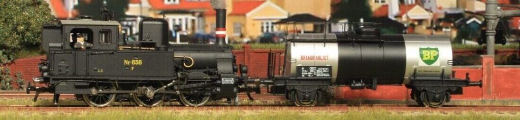 Dengang damplokomotiverne var i daglig drift, var det ikke kun kul, der skulle transporteres til remisen, men også smøreolie til de bevægelige dele i gangtøjet. Dette er illustreret her med en tankvogn, som bliver skubbet hen mod remisen.
