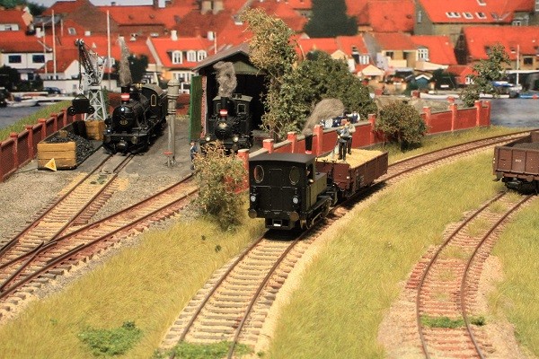 Ved siden af remisen holder en D-maskine, som er ved at blive forsynet med kul fra kulgården. Foran remisen holder en F-maskine pause, mens personalet samles ved vandkranen. På sporet ved siden af remisen rangerer en lille to-koblet maskine, Litra Hs. Den er en ombygget Fleischmann-maskine af typen “Sorte Anna” fra et startsæt, hvor skorstenen har fået påsat det karakteristiske rødhvidrøde skorstensbånd.